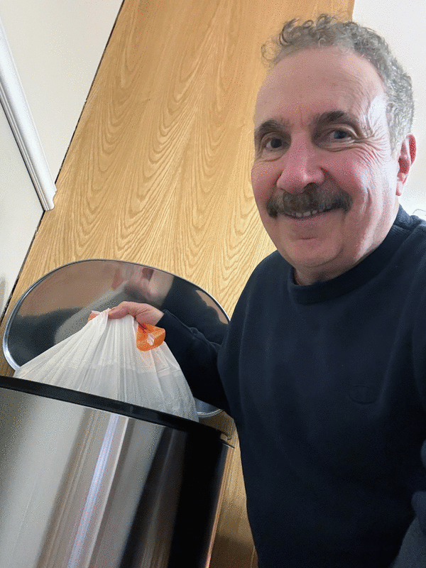 Now my work entails not only producing garbage, but throwing it out. Thanks to our shiny new garbage can, which prevents me from littering the kitchen floor with napkin balls, Sue won’t kick me to the curb.